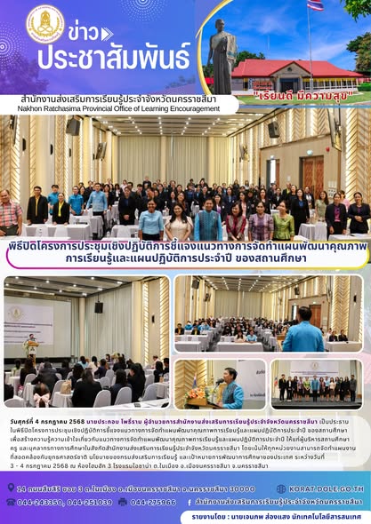 ครู และบุคลากรทางการศึกษาในสังกัดสำนักงานส่งเสริมการเรียนรู้ประจำจังหวัดนครราชสีมา โดยเน้นให้ทุกหน่วยงานสามารถจัดทำแผนงานที่สอดคล้องกับยุทธศาสตร์ชาติ นโยบายของกรมส่งเสริมการเรียนรู้ และเป้าหมายการพัฒนาการศึกษาของประเทศ ระหว่างวันที่
