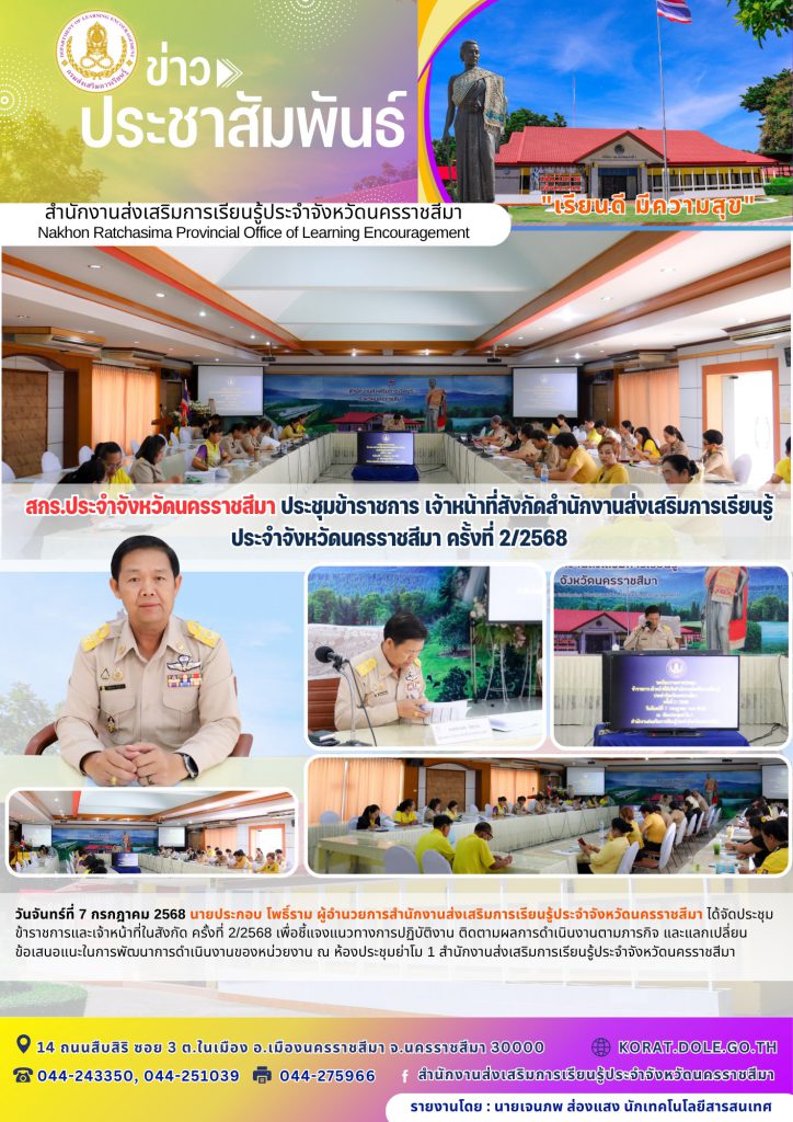 วันจันทร์ที่ 7 กรกฎาคม 2568 นายประกอบ โพธิ์ราม ผู้อำนวยการสำนักงานส่งเสริมการเรียนรู้ประจำจังหวัดนครราชสีมา ได้จัดประชุมข้าราชการและเจ้าหน้าที่ในสังกัด ครั้งที่ 2/2568 เพื่อชี้แจงแนวทางการปฏิบัติงาน ติดตามผลการดำเนินงานตามภารกิจ และแลกเปลี่ยน