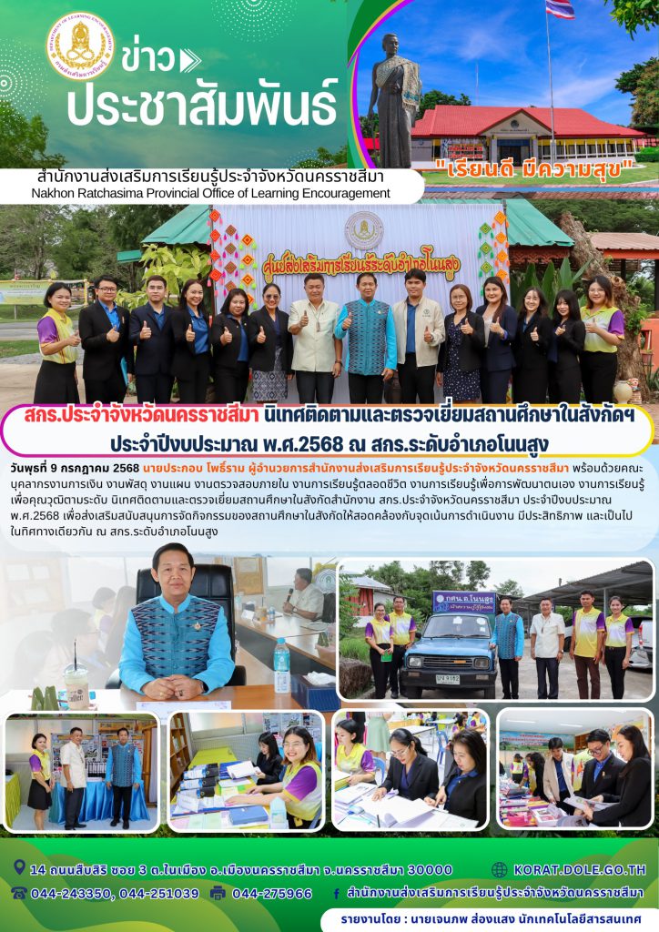 วันพุธที่ 9 กรกฎาคม 2568 นายประกอบ โพธิ์ราม ผู้อำนวยการสำนักงานส่งเสริมการเรียนรู้ประจำจังหวัดนครราชสีมา พร้อมด้วยคณะบุคลากรงานการเงิน งานพัสดุ งานแผน งานตรวจสอบภายใน งานการเรียนรู้ตลอดชีวิต งานการเรียนรู้เพื่อการพัฒนาตนเอง งานการเรียนรู้เพื่อคุณวุฒิตามระดับ นิเทศติดตามและตรวจเยี่ยมสถานศึกษาในสังกัดสำนักงาน สกร.ประจำจังหวัดนครราชสีมา ประจำปีงบประมาณ พ.ศ.2568 เพื่อส่งเสริมสนับสนุนการจัดกิจกรรมของสถานศึกษาในสังกัดให้สอดคล้องกับจุดเน้นการดำเนินงาน มีประสิทธิภาพ และเป็นไปในทิศทางเดียวกัน ณ สกร.ระดับอำเภอโนนสูง