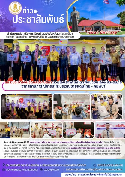 วันเสาร์ที่ 26 กรกฎาคม 2568 นายประกอบ โพธิ์ราม ผู้อำนวยการสำนักงานส่งเสริมการเรียนรู้ประจำจังหวัดนครราชสีมา นำคณะผู้บริหาร ครู และบุคลากรทางการศึกษา ร่วมบริจาคโลหิตเพื่อช่วยเหลือผู้ประสบภัยจากสถานการณ์ความไม่สงบในเขตชายแดนไทย–กันพูชา ณ ห้องรับบริจาคโลหิตชั้น G ศูนย์การค้า terminal 21 โคราช กิจกรรมในครั้งนี้จัดขึ้นภายใต้การนำของ นายเทวัญ ลิปตพัลลภ รัฐมนตรีช่วยว่าการกระทรวงศึกษาธิการ