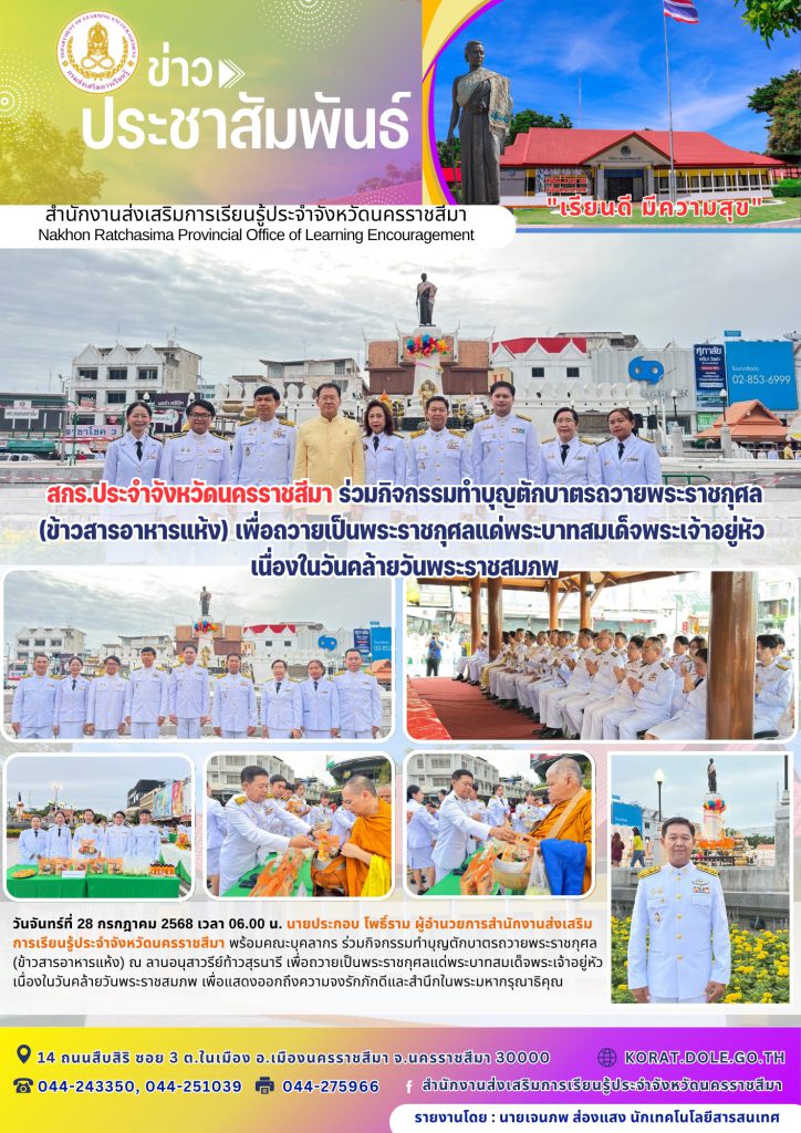วันจันทร์ที่ 28 กรกฎาคม 2568 เวลา 06.00 น. นายประกอบ โพธิ์ราม ผู้อำนวยการสำนักงานส่งเสริมการเรียนรู้ประจำจังหวัดนครราชสีมา พร้อมคณะบุคลากร ร่วมกิจกรรมทำบุญตักบาตรถวายพระราชกุศล (ข้าวสารอาหารแห้ง) ณ ลานอนุสาวรีย์ท้าวสุรนารี เพื่อถวายเป็นพระราชกุศลแด่พระบาทสมเด็จพระเจ้าอยู่หัว เนื่องในวันคล้ายวันพระราชสมภพ เพื่อแสดงออกถึงความจงรักภักดีและสำนึกในพระมหากรุณาธิคุณ