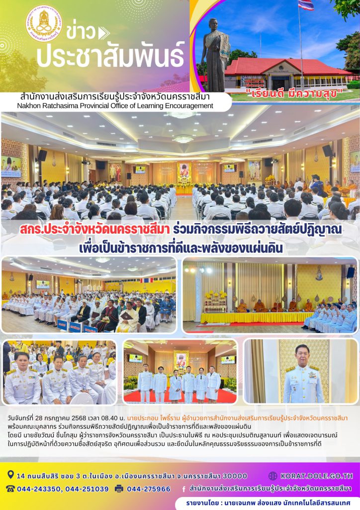 วันจันทร์ที่ 28 กรกฎาคม 2568 เวลา 08.40 น. นายประกอบ โพธิ์ราม ผู้อำนวยการสำนักงานส่งเสริมการเรียนรู้ประจำจังหวัดนครราชสีมา พร้อมคณะบุคลากร ร่วมกิจกรรมพิธีถวายสัตย์ปฏิญาณเพื่อเป็นข้าราชการที่ดีและพลังของแผ่นดิน