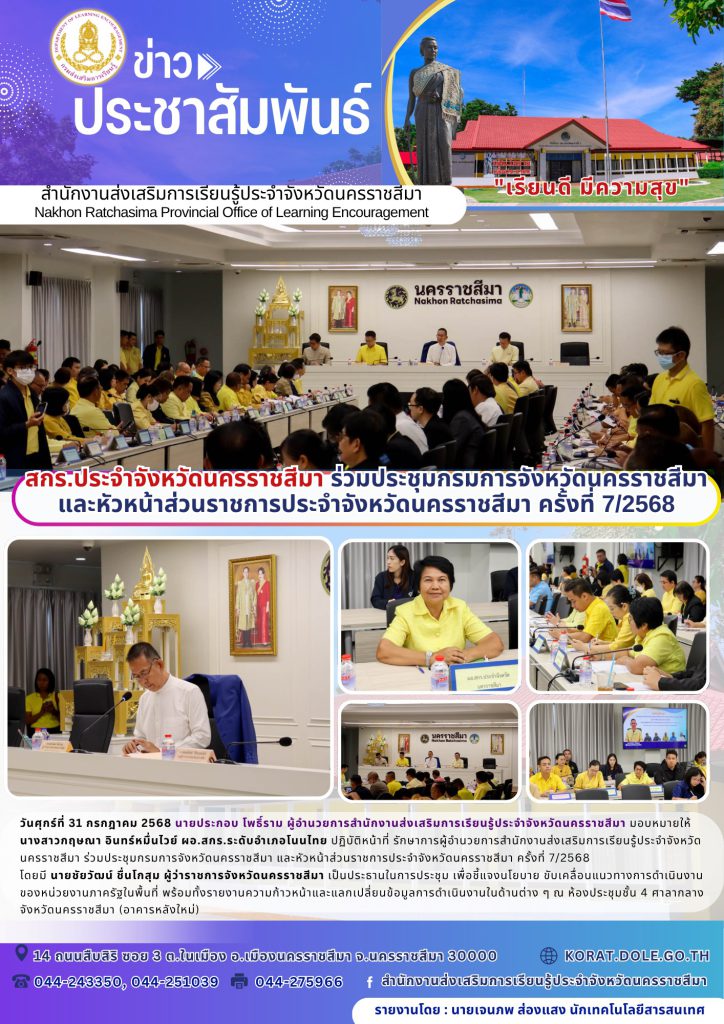 วันศุกร์ที่ 31 กรกฎาคม 2568 นายประกอบ โพธิ์ราม ผู้อำนวยการสำนักงานส่งเสริมการเรียนรู้ประจำจังหวัดนครราชสีมา มอบหมายให้ นางสาวกฤษณา อินทร์หมื่นไวย์ ผอ.สกร.ระดับอำเภอโนนไทย ปฏิบัติหน้าที่ รักษาการผู้อำนวยการสำนักงานส่งเสริมการเรียนรู้ประจำจังหวัดนครราชสีมา ร่วมประชุมกรมการจังหวัดนครราชสีมา และหัวหน้าส่วนราชการประจำจังหวัดนครราชสีมา ครั้งที่ 7/2568