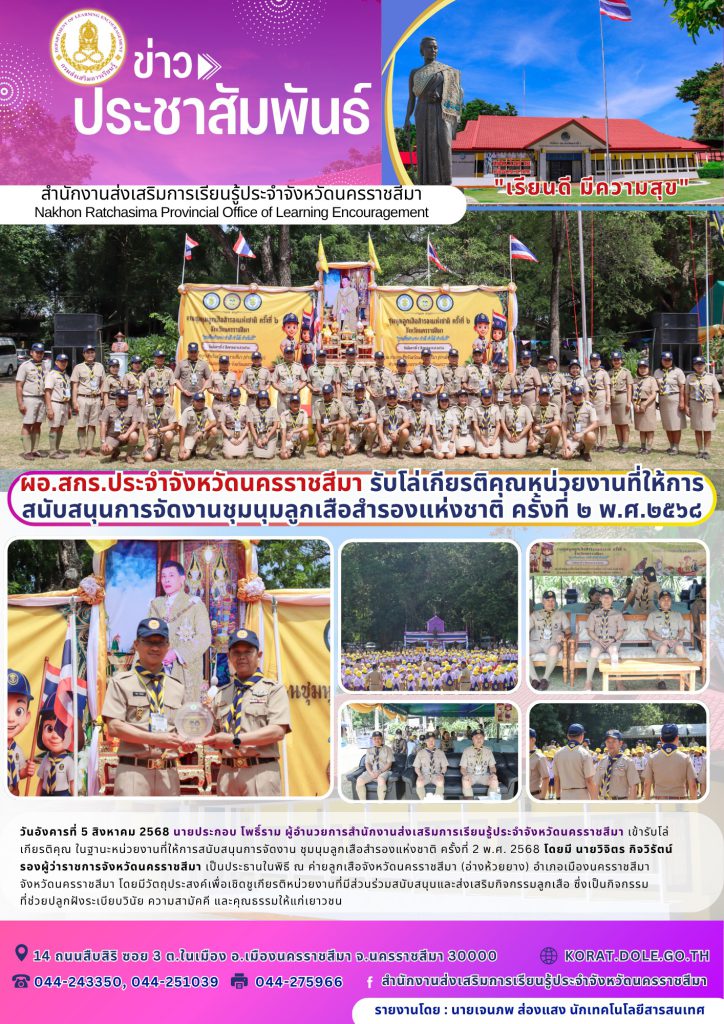 วันอังคารที่ 5 สิงหาคม 2568 นายประกอบ โพธิ์ราม ผู้อำนวยการสำนักงานส่งเสริมการเรียนรู้ประจำจังหวัดนครราชสีมา เข้ารับโล่เกียรติคุณ ในฐานะหน่วยงานที่ให้การสนับสนุนการจัดงาน ชุมนุมลูกเสือสำรองแห่งชาติ ครั้งที่ 2 พ.ศ. 2568 โดยมีนายวิจิตร กิจวิรัตน์
