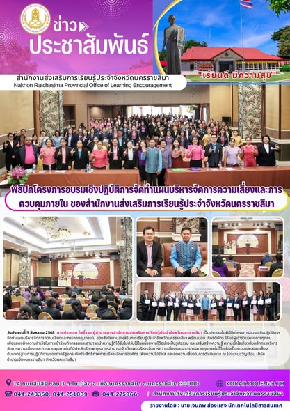 วันอังคารที่ 5 สิงหาคม 2568 นายประกอบ โพธิ์ราม ผู้อำนวยการสำนักงานส่งเสริมการเรียนรู้ประจำจังหวัดนครราชสีมา เป็นประธานในพิธีปิดโครงการอบรมเชิงปฏิบัติการจัดทำแผนบริหารจัดการความเสี่ยงและการควบคุมภายใน ของสำนักงานส่งเสริมการเรียนรู้ประจำจังหวัดนครราชสีมา พร้อมมอบ เกียรติบัตร ให้แก่ผู้เข้าร่วมโครงการทุกคน