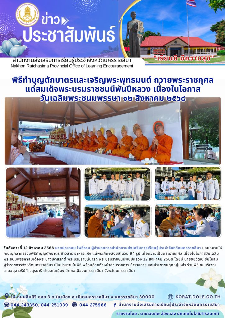 วันอังคารที่ 12 สิงหาคม 2568 นายประกอบ โพธิ์ราม ผู้อำนวยการสำนักงานส่งเสริมการเรียนรู้ประจำจังหวัดนครราชสีมา มอบหมายให้คณะบุคลากรร่วมพิธีทำบุญตักบาตร ข้าวสาร อาหารแห้ง แด่พระภิกษุสงฆ์จำนวน 94 รูป เพื่อถวายเป็นพระราชกุศล เนื่องในโอกาสวันเฉลิมพระชนมพรรษาสมเด็จพระนางเจ้าสิริกิติ์ พระบรมราชินีนารถ พระบรมราชชนนีพันปีหลวง 12 สิงหาคม 2568 โดยมี นายชัยวัฒน์ ชื่นโกสุม