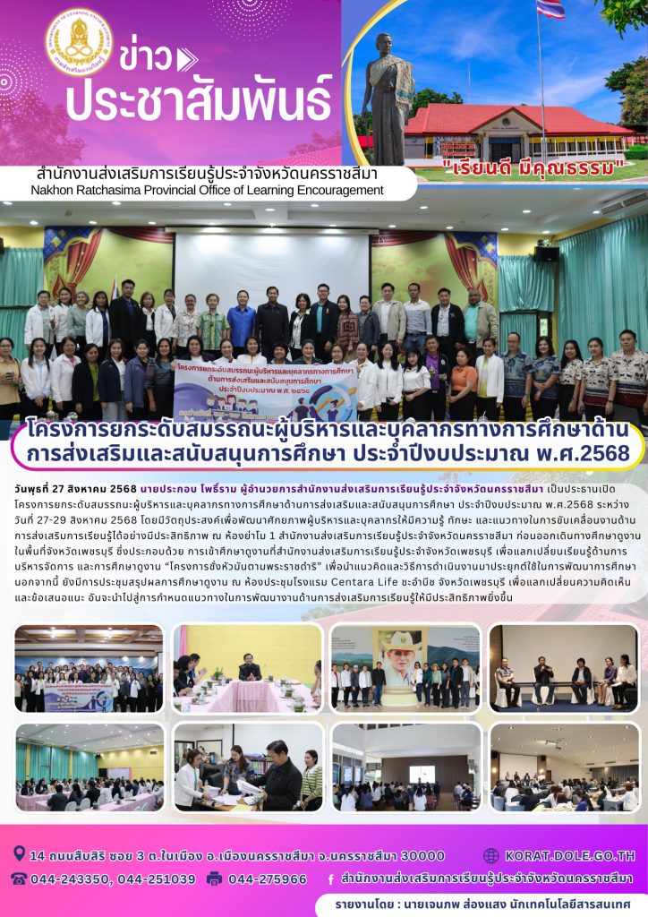 วันพุธที่ 27 สิงหาคม 2568 นายประกอบ โพธิ์ราม ผู้อำนวยการสำนักงานส่งเสริมการเรียนรู้ประจำจังหวัดนครราชสีมา เป็นประธานเปิด โครงการยกระดับสมรรถนะผู้บริหารและบุคลากรทางการศึกษาด้านการส่งเสริมและสนับสนุนการศึกษา ประจำปีงบประมาณ พ.ศ.2568 ระหว่าง
