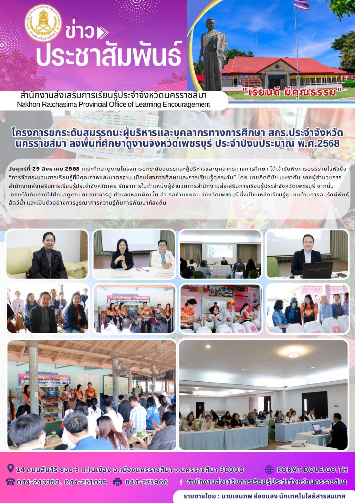 โครงการยกระดับสมรรถนะผู้บริหารและบุคลากรทางการศึกษา สกร.ประจำจังหวัดนครราชสีมา ลงพื้นที่ศึกษาดูงานจังหวัดเพชรบุรี ประจำปีงบประมาณ พ.ศ.2568