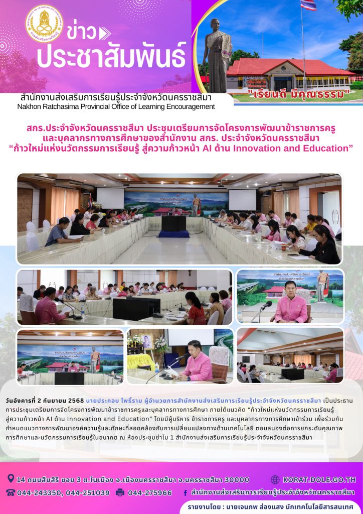 วันอังคารที่ 2 กันยายน 2568 นายประกอบ โพธิ์ราม ผู้อำนวยการสำนักงานส่งเสริมการเรียนรู้ประจำจังหวัดนครราชสีมา เป็นประธานการประชุมเตรียมการจัดโครงการพัฒนาข้าราชการครูและบุคลากรทางการศึกษา ภายใต้แนวคิด “ก้าวใหม่แห่งนวัตกรรมการเรียนรู้ สู่ความก้าวหน้า AI ด้าน Innovation and Education” โดยมีผู้บริหาร ข้าราชการครู และบุคลากรทางการศึกษาเข้าร่วม เพื่อร่วมกันกำหนดแนวทางการพัฒนาองค์ความรู้และทักษะที่สอดคล้องกับการเปลี่ยนแปลงทางด้านเทคโนโลยี ตอบสนองต่อการยกระดับคุณภาพการศึกษาและนวัตกรรมการเรียนรู้ในอนาคต ณ ห้องประชุมย่าโม 1 สำนักงานส่งเสริมการเรียนรู้ประจำจังหวัดนครราชสีมา
