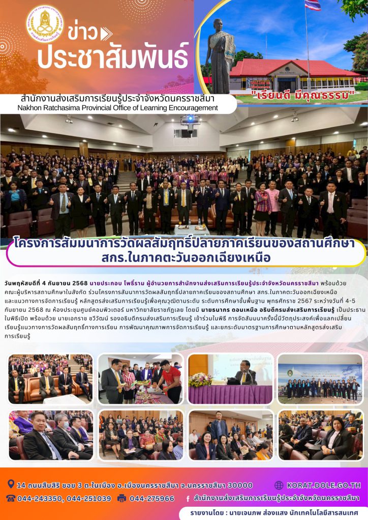 วันพฤหัสบดีที่ 4 กันยายน 2568 นายประกอบ โพธิ์ราม ผู้อำนวยการสำนักงานส่งเสริมการเรียนรู้ประจำจังหวัดนครราชสีมา พร้อมด้วยคณะผู้บริหารสถานศึกษาในสังกัด ร่วมโครงการสัมนาการวัดผลสัมฤทธิ์ปลายภาคเรียนของสถานศึกษา สกร.ในภาคตะวันออกเฉียงเหนือและแนวทางการจัดการเรียนรู้ หลักสูตรส่งเสริมการเรียนรู้เพื่อคุณวุฒิตามระดับ ระดับการศึกษาขั้นพื้นฐาน พุทธศักราช 2567 ระหว่างวันที่ 4-5 กันยายน 2568 ณ ห้องประชุมศูนย์คอมพิวเตอร์ มหาวิทยาลัยราชภัฏเลย โดยมี นายธนากร ดอนเหนือ อธิบดีกรมส่งเสริมการเรียนรู้ เป็นประธานในพิธีเปิด พร้อมด้วย นายเอกราช ชวีวัฒน์ รองอธิบดีกรมส่งเสริมการเรียนรู้ เข้าร่วมในพิธี การจัดสัมมนาครั้งนี้มีวัตถุประสงค์เพื่อแลกเปลี่ยนเรียนรู้แนวทางการวัดผลสัมฤทธิ์ทางการเรียน การพัฒนาคุณภาพการจัดการเรียนรู้ และยกระดับมาตรฐานการศึกษาตามหลักสูตรส่งเสริมการเรียนรู้