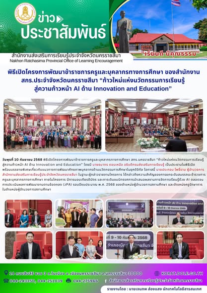 วันพุธที่ 10 กันยายน 2568 พิธีเปิดโครงการพัฒนาข้าราชการครูและบุคลากรทางการศึกษา สกร.นครราชสีมา “ก้าวใหม่แห่งนวัตกรรมการเรียนรู้ สู่ความก้าวหน้า AI ด้าน Innovation and Education” โดยมี นายธนากร ดอนเหนือ อธิบดีกรมส่งเสริมการเรียนรู้ เป็นประธานในพิธีเปิด
