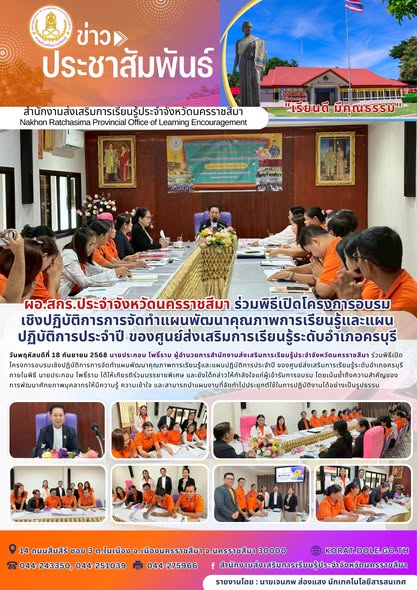 วันพฤหัสบดีที่ 18 กันยายน 2568 นายประกอบ โพธิ์ราม ผู้อำนวยการสำนักงานส่งเสริมการเรียนรู้ประจำจังหวัดนครราชสีมา ร่วมพิธีเปิดโครงการอบรมเชิงปฏิบัติการการจัดทำแผนพัฒนาคุณภาพการเรียนรู้และแผนปฏิบัติการประจำปี ของศูนย์ส่งเสริมการเรียนรู้ระดับอำเภอครบุรี