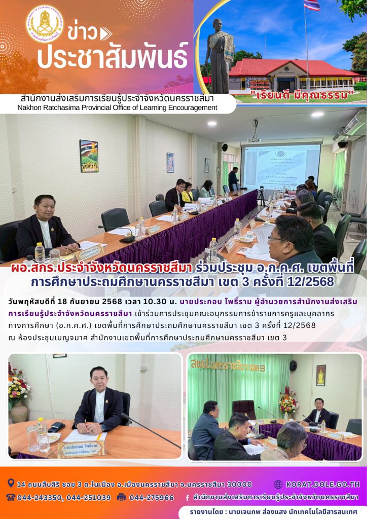 ผอ.สกร.ประจำจังหวัดนครราชสีมา ร่วมประชุม อ.ก.ค.ศ. เขตพื้นที่การศึกษาประถมศึกษานครราชสีมา เขต 3 ครั้งที่ 12/2568