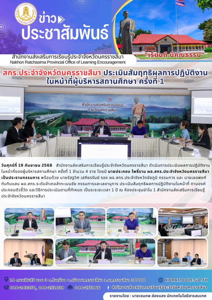 วันศุกร์ที่ 19 กันยายน 2568 สำนักงานส่งเสริมการเรียนรู้ประจำจังหวัดนครราชสีมา ดำเนินการประเมินผลการปฏิบัติงานในหน้าที่ของผู้บริหารสถานศึกษา ครั้งที่ 1 จำนวน 4 ราย โดยมี นายประกอบ โพธิ์ราม ผอ.สกร.ประจำจังหวัดนครราชสีมา เป็นประธานกรรมการ พร้อมด้วย นายรัสฐวิศ เสถียรรัมย์ รอง ผอ.สกร.ประจำจังหวัดชัยภูมิ กรรมการ และ นายเลอพงศ์ ทับทิมแสน ผอ.สกร.ระดับอำเภอลำทะเมนชัย กรรมการและเลขานุการ ประเมินสัมฤทธิผลการปฏิบัติงานในหน้าที่ ตามองค์ประกอบตัวชี้วัด และวีธีการประเมินตามที่กำหนด เป็นระระยะเวลา 1 ปี ณ ห้องประชุมย่าโม 1 สำนักงานส่งเสริมการเรียนรู้ประจำจังหวัดนครราชสีมา