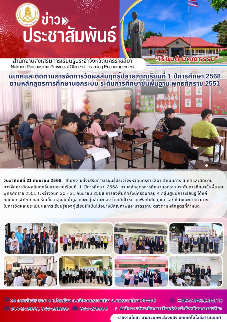 วันอาทิตย์ที่ 21 กันยายน 2568 สำนักงานส่งเสริมการเรียนรู้ประจำจังหวัดนครราชสีมา ดำเนินการ นิเทศและติดตามการจัดการวัดผลสัมฤทธิ์ปลายภาคเรียนที่ 1 ปีการศึกษา 2568 ตามหลักสูตรการศึกษานอกระบบระดับการศึกษาขั้นพื้นฐาน พุทธศักราช 2551 ระหว่างวันที่ 20 – 21 กันยายน 2568 การลงพื้นที่ครั้งนี้ครอบคลุม 4 กลุ่มศูนย์การเรียนรู้ ได้แก่