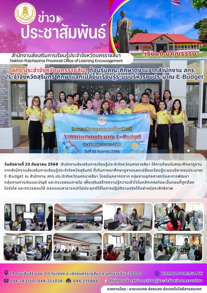 วันอังคารที่ 23 กันยายน 2568 สำนักงานส่งเสริมการเรียนรู้ประจำจังหวัดนครราชสีมา ให้การต้อนรับคณะศึกษาดูงานจากสำนักงานส่งเสริมการเรียนรู้ประจำจังหวัดสุรินทร์ ที่เดินทางมาศึกษาดูงานแลกเปลี่ยนเรียนรู้ระบบบริหารงบประมาณ E-Budget ณ สำนักงาน สกร.ประจำจังหวัดนครราชสีมา โดยมีบุคลากรจาก กลุ่มงานยุทธศาสตร์และการพัฒนา