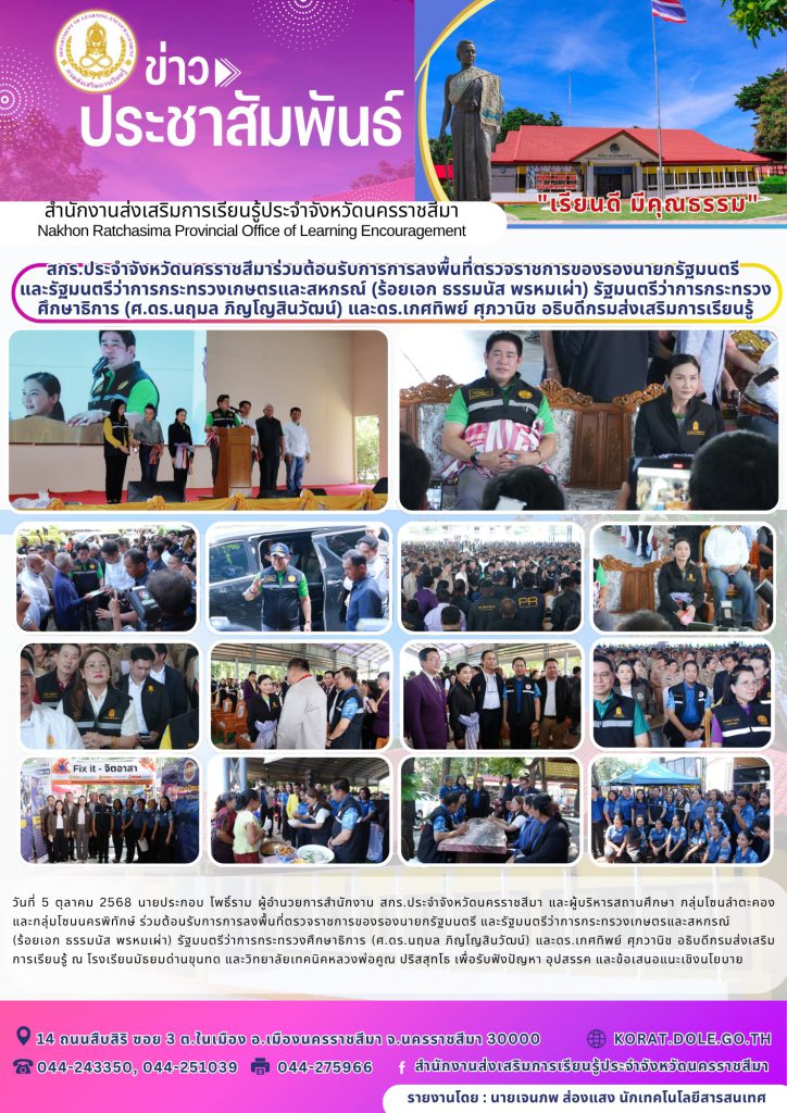 วันที่ 5 ตุลาคม 2568 นายประกอบ โพธิ์ราม ผู้อำนวยการสำนักงาน สกร.ประจำจังหวัดนครราชสีมา และผู้บริหารสถานศึกษา กลุ่มโซนลำตะคอง และกลุ่มโซนนครพิทักษ์ ร่วมต้อนรับลงพื้นที่ตรวจราชการของรองนายกรัฐมนตรี และรัฐมนตรีว่าการกระทรวงเกษตรและสหกรณ์ (ร้อยเอก ธรรมนัส พรหมเผ่า) รัฐมนตรีว่าการกระทรวงศึกษาธิการ (ศ.ดร.นฤมล ภิญโญสินวัฒน์) และดร.เกศทิพย์ ศุภวานิช อธิบดีกรมส่งเสริมการเรียนรู้ ณ โรงเรียนมัธยมด่านขุนทด และวิทยาลัยเทคนิคหลวงพ่อคูณ ปริสสุทโธ เพื่อรับฟังปัญหา อุปสรรค และข้อเสนอแนะเชิงนโยบาย