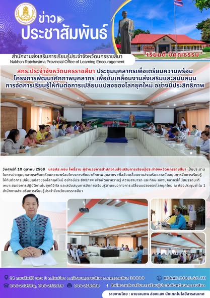 วันศุกร์ที่ 10 ตุลาคม 2568 นายประกอบ โพธิ์ราม ผู้อำนวยการสำนักงานส่งเสริมการเรียนรู้ประจำจังหวัดนครราชสีมา เป็นประธาน