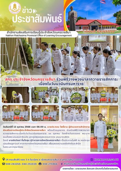 วันจันทร์ที่ 13 ตุลาคม 2568 เวลา 08.00 น. นายประกอบ โพธิ์ราม ผู้อำนวยการสำนักงานส่งเสริมการเรียนรู้ประจำจังหวัดนครราชสีมา พร้อมด้วยบุคลากร ร่วมร่วมพิธีวางพวงมาลาถวายราชสักการะเนื่องในวันวันนวมินทรมหาราช ๑๓ ตุลาคม วันคล้ายวันสวรรคต พระบาทสมเด็จพระบรมชนกาธิเบศร มหาภูมิพลอดุลยเดชมหาราช บรมนาถบพิตร