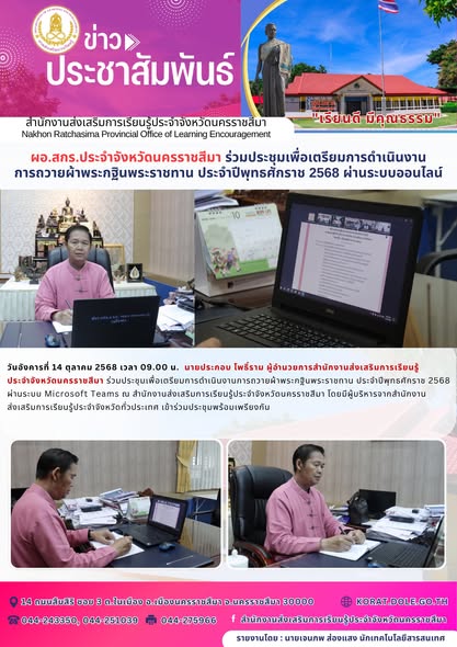 วันอังคารที่ 14 ตุลาคม 2568 เวลา 09.00 น. นายประกอบ โพธิ์ราม ผู้อำนวยการสำนักงานส่งเสริมการเรียนรู้ ประจำจังหวัดนครราชสีมา ร่วมประชุมเพื่อเตรียมการดำเนินงานการถวายผ้าพระกฐินพระราชทาน ประจำปีพุทธศักราช 2568 ผ่านระบบ Microsoft Teams ณ สำนักงานส่งเสริมการเรียนรู้ประจำจังหวัดนครราชสีมา โดยมีผู้บริหารจากสำนักงานส่งเสริมการเรียนรู้ประจำจังหวัดทั่วประเทศ เข้าร่วมประชุมพร้อมเพรียงกัน