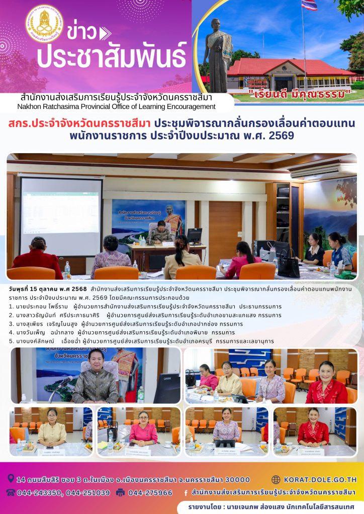 วันพุธที่ 15 ตุลาคม พ.ศ 2568 สำนักงานส่งเสริมการเรียนรู้ประจำจังหวัดนครราชสีมา ประชุมพิจารณากลั่นกรองเลื่อนค่าตอบแทนพนักงานราชการ ประจำปีงบประมาณ พ.ศ. 2569 โดยมีคณะกรรมการประกอบด้วย