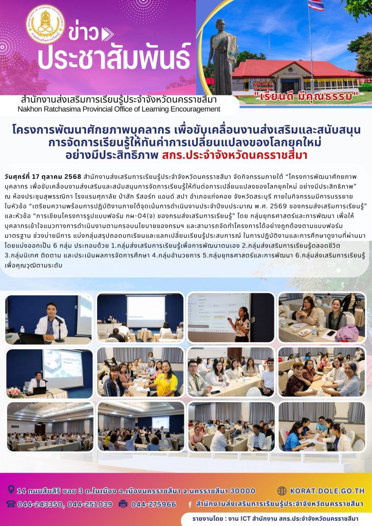 วันศุกร์ที่ 17 ตุลาคม 2568 สำนักงานส่งเสริมการเรียนรู้ประจำจังหวัดนครราชสีมา จัดกิจกรรมภายใต้ “โครงการพัฒนาศักยภาพบุคลากร เพื่อขับเคลื่อนงานส่งเสริมและสนับสนุนการจัดการเรียนรู้ให้ทันต่อการเปลี่ยนแปลงของโลกยุคใหม่ อย่างมีประสิทธิภาพ”