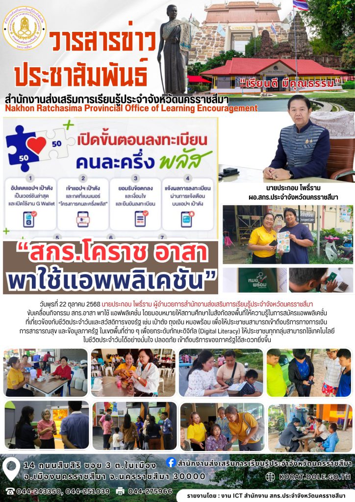 วันพุธที่ 22 ตุลาคม 2568 นายประกอบ โพธิ์ราม ผู้อำนวยการสำนักงานส่งเสริมการเรียนรู้ประจำจังหวัดนครราชสีมา