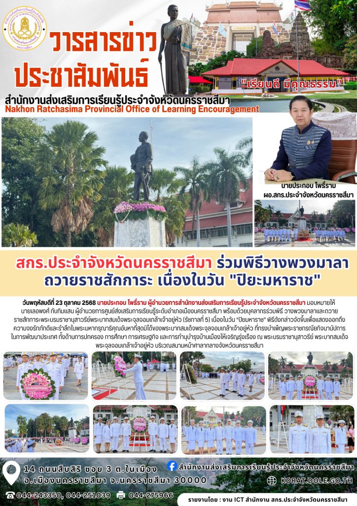 วันพฤหัสบดีที่ 23 ตุลาคม 2568 นายประกอบ โพธิ์ราม ผู้อำนวยการสำนักงานส่งเสริมการเรียนรู้ประจำจังหวัดนครราชสีมา มอบหมายให้