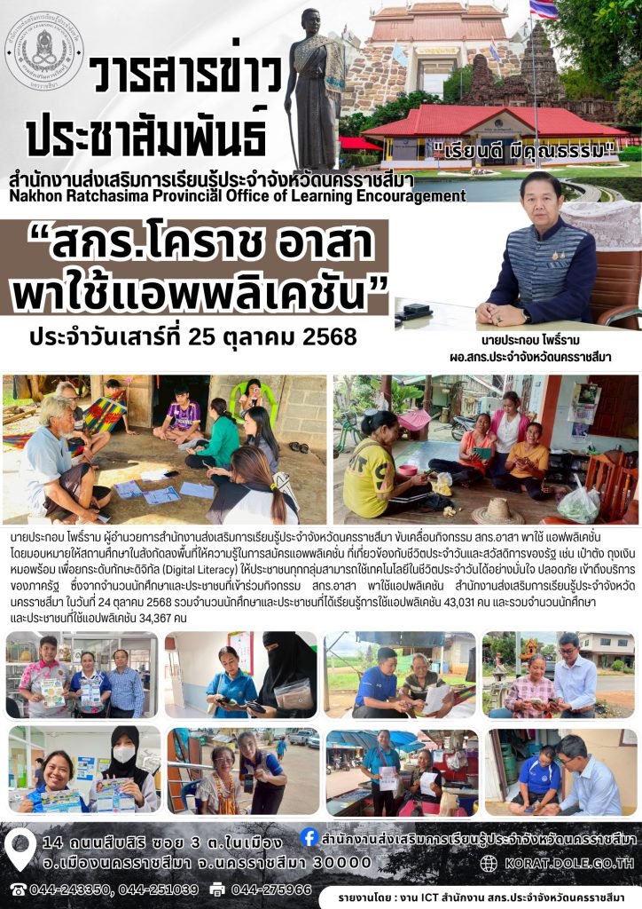 นายประกอบ โพธิ์ราม ผู้อำนวยการสำนักงานส่งเสริมการเรียนรู้ประจำจังหวัดนครราชสีมา ขับเคลื่อนกิจกรรม สกร.อาสา พาใช้ แอฟพลิเคชั่นโดยมอบหมายให้สถานศึกษาในสังกัดลงพื้นที่ให้ความรู้ในการสมัครแอพพลิเคชั่น ที่เกี่ยวข้องกับชีวิตประจำวันและสวัสดิการของรัฐ เช่น เป๋าตัง ถุงเงิน หมอพร้อม เพื่อยกระดับทักษะดิจิทัล (Digital Literacy) ให้ประชาชนทุกกลุ่มสามารถใช้เทคโนโลยีในชีวิตประจำวันได้อย่างมั่นใจ ปลอดภัย เข้าถึงบริการของภาครัฐ ซึ่งจากจำนวนนักศึกษาและประชาชนที่เข้าร่วมกิจกรรม สกร.อาสา พาใช้แอปพลิเคชัน สำนักงานส่งเสริมการเรียนรู้ประจำจังหวัดนครราชสีมา ในวันที่ 24 ตุลาคม 2568 รวมจำนวนนักศึกษาและประชาชนที่ได้เรียนรู้การใช้แอปพลิเคชัน 43,031 คน และรวมจำนวนนักศึกษาและประชาชนที่ใช้แอปพลิเคชัน 34,367 คน