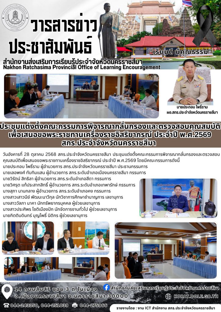 วันอังคารที่ 28 ตุลาคม 2568 สกร.ประจำจังหวัดนครราชสีมา ประชุมแต่งตั้งคณะกรรมการพิจารณากลั่นกรองและตรวจสอบคุณสมบัติเพื่อเสนอขอพระราชทานเครื่องราชอิสริยาภรณ์ ประจำปี พ.ศ.2569 โดยมีคณะกรรมการดังนี้