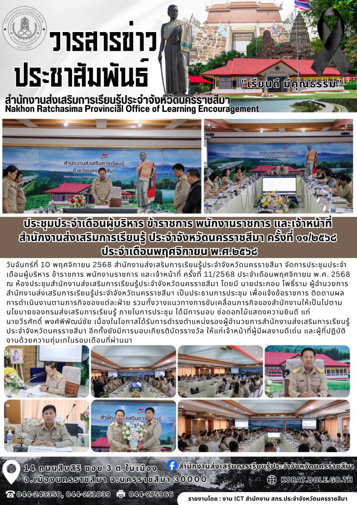 ประชุมประจําเดือนผู้บริหาร ข้าราชการ พนักงานราชการ และเจ้าหน้าที่สํานักงานส่งเสริมการเรียนรู้ ประจําจังหวัดนครราชสีมา ครั้งที่ ๑๑/๒๕๖๘ ประจําเดือนพฤศจิกายน พ.ศ.๒๕๖๘