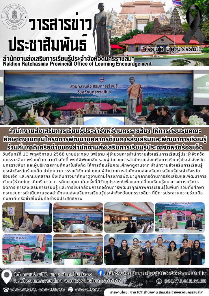 วันจันทร์ที่ 10 พฤศจิกายน 2568 นายประกอบ โพธิ์ราม ผู้อำนวยการสำนักงานส่งเสริมการเรียนรู้ประจำจังหวัดนครราชสีมา พร้อมด้วย นายวีรศักดิ์ พงศ์พิพัฒน์ชัย รองผู้อำนวยการสำนักงานส่งเสริมการเรียนรุ้ประจำจังหวัดนครราชสีมา และผู้บริหารสถานศึกษาในสังกัด ให้การต้อนรับคณะศึกษาดูงานจาก สำนักงานส่งเสริมการเรียนรู้ประจำจังหวัดร้อยเอ็ด นำโดยนาย วรรณวิจักษณ์ กุศล ผู้อำนวยการสำนักงานส่งเสริมการเรียนรู้ประจำจังหวัดร้อยเอ็ด และคณะบุคลากร ซึ่งเดินทางมาศึกษาดูงานตามโครงการพัฒนาบุคลากรด้านการส่งเสริมและพัฒนาการเรียนรู้ร่วมกับภาคีเครือข่าย การศึกษาดูงานในครั้งนี้มีวัตถุประสงค์เพื่อแลกเปลี่ยนเรียนรู้แนวทางการบริหารจัดการ การส่งเสริมการเรียนรู้ และการขับเคลื่อนภารกิจด้านการพัฒนาคุณภาพการเรียนรู้ในพื้นที่ รวมทั้งศึกษากระบวนการดำเนินงานของสำนักงานส่งเสริมการเรียนรู้ประจำจังหวัดนครราชสีมา ที่มีการประสานความร่วมมือกับภาคีเครือข่ายในพื้นที่อย่างมีประสิทธิภาพ