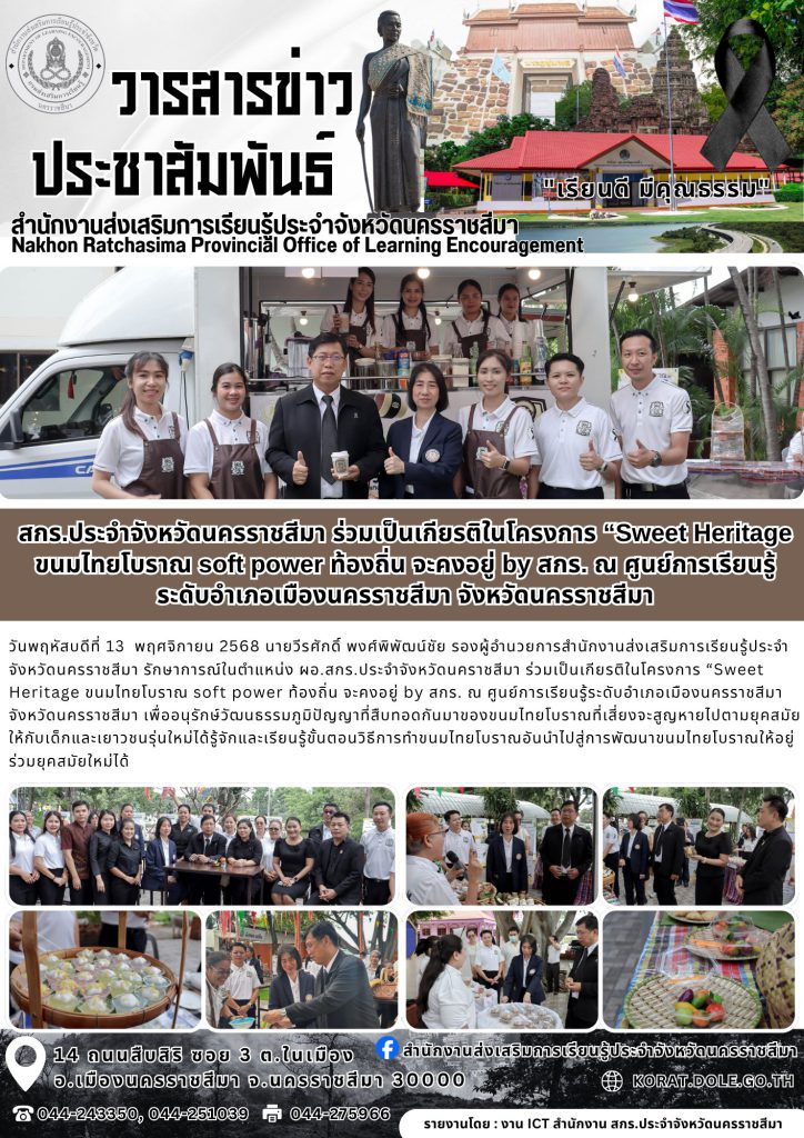 วันพฤหัสบดีที่ 13 พฤศจิกายน 2568 นายวีรศักดิ์ พงศ์พิพัฒน์ชัย รองผู้อำนวยการสำนักงานส่งเสริมการเรียนรู้ประจำจังหวัดนครราชสีมา รักษาการณ์ในตำแหน่ง ผอ.สกร.ประจำจังหวัดนคราชสีมา ร่วมเป็นเกียรติในโครงการ “Sweet Heritage ขนมไทยโบราณ soft power ท้องถิ่น จะคงอยู่ by สกร. ณ ศูนย์การเรียนรู้ระดับอำเภอเมืองนครราชสีมา จังหวัดนครราชสีมา เพื่ออนุรักษ์วัฒนธรรมภูมิปัญญาที่สืบทอดกันมาของขนมไทยโบราณที่เสี่ยงจะสูญหายไปตามยุคสมัยให้กับเด็กและเยาวชนรุ่นใหม่ได้รู้จักและเรียนรู้ขั้นตอนวิธีการทำขนมไทยโบราณอันนำไปสู่การพัฒนาขนมไทยโบราณให้อยู่ร่วมยุคสมัยใหม่ได้