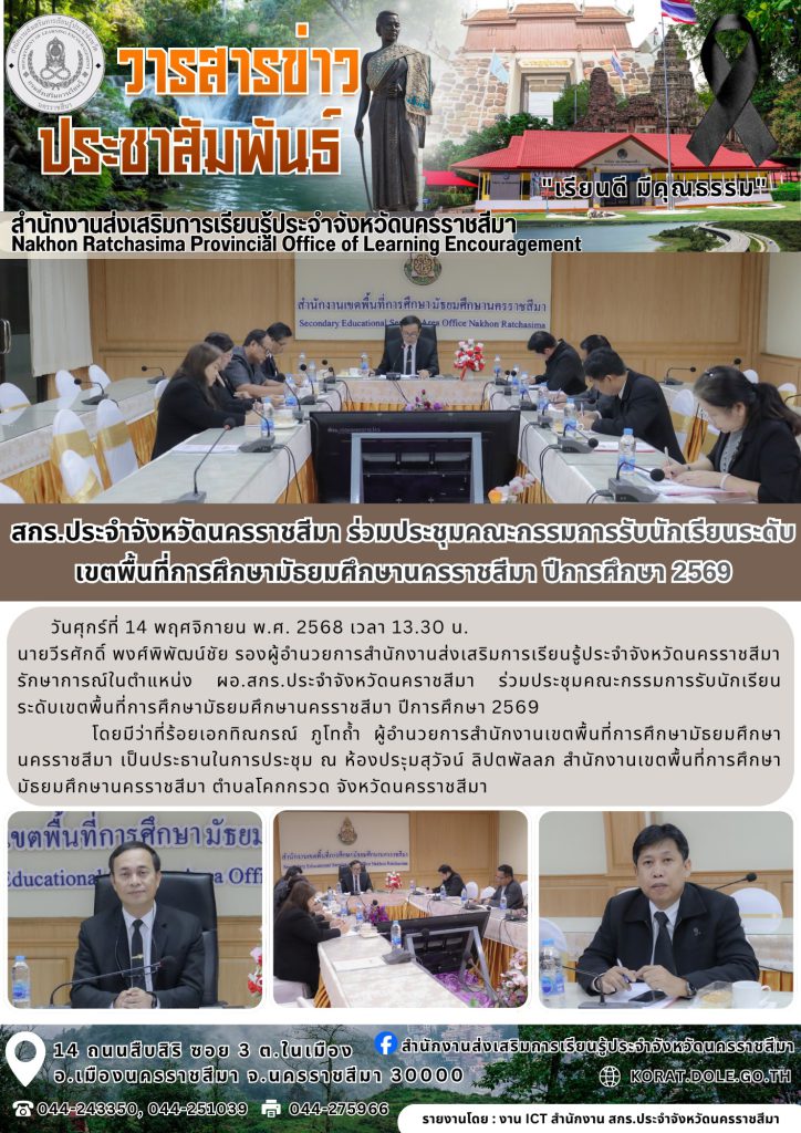 วันศุกร์ที่ 14 พฤศจิกายน พ.ศ. 2568 เวลา 13.30 น. นายวีรศักดิ์ พงศ์พิพัฒน์ชัย รองผู้อำนวยการสำนักงานส่งเสริมการเรียนรู้ประจำจังหวัดนครราชสีมารักษาการณ์ในตำแหน่ง ผอ.สกร.ประจำจังหวัดนคราชสีมา ร่วมประชุมคณะกรรมการรับนักเรียนระดับเขตพื้นที่การศึกษามัธยมศึกษานครราชสีมา ปีการศึกษา 2569 โดยมีว่าที่ร้อยเอกทิณกรณ์ ภูโทถ้ำ ผู้อำนวยการสำนักงานเขตพื้นที่การศึกษามัธยมศึกษานครราชสีมา เป็นประธานในการประชุม ณ ห้องประุมสุวัจน์ ลิปตพัลลภ สำนักงานเขตพื้นที่การศึกษามัธยมศึกษานครราชสีมา ตำบลโคกกรวด จังหวัดนครราชสีมา