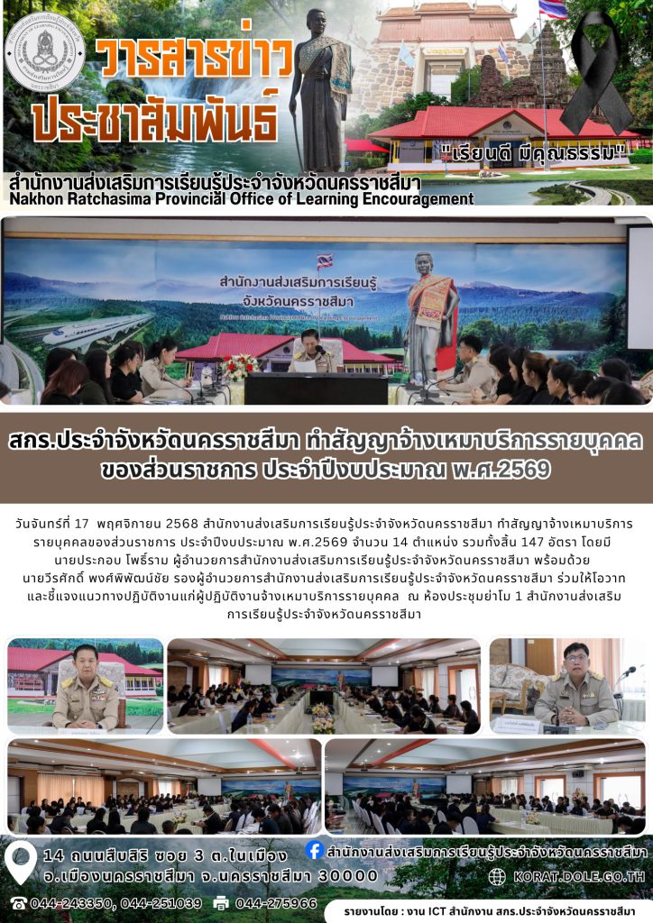 วันจันทร์ที่ 17 พฤศจิกายน 2568 สำนักงานส่งเสริมการเรียนรู้ประจำจังหวัดนครราชสีมา ทำสัญญาจ้างเหมาบริการรายบุคคลของส่วนราชการ ประจำปีงบประมาณ พ.ศ.2569 จำนวน 14 ตำแหน่ง รวมทั้งสิ้น 147 อัตรา โดยมี นายประกอบ โพธิ์ราม ผู้อำนวยการสำนักงานส่งเสริมการเรียนรู้ประจำจังหวัดนครราชสีมา พร้อมด้วย นายวีรศักดิ์ พงศ์พิพัฒน์ชัย รองผู้อำนวยการสำนักงานส่งเสริมการเรียนรู้ประจำจังหวัดนครราชสีมา ร่วมให้โอวาทและชี้แจงแนวทางปฏิบัติงานแก่ผู้ปฏิบัติงานจ้างเหมาบริการรายบุคคล ณ ห้องประชุมย่าโม 1 สำนักงานส่งเสริมการเรียนรู้ประจำจังหวัดนครราชสีมา