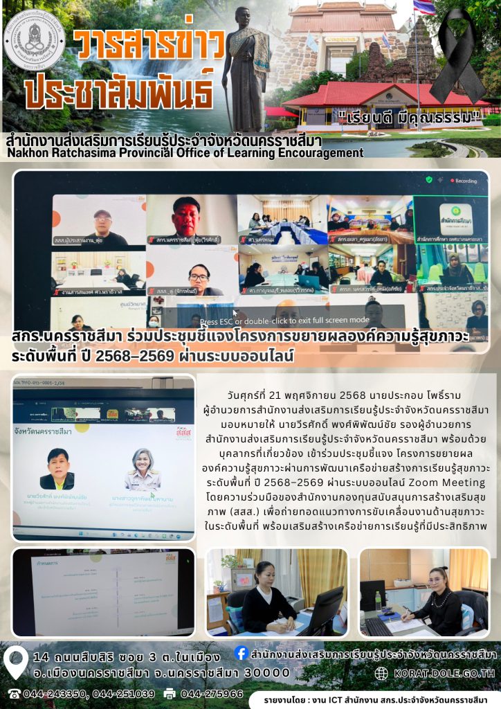 วันศุกร์ที่ 21 พฤศจิกายน 2568 นายประกอบ โพธิ์ราม ผู้อำนวยการสำนักงานส่งเสริมการเรียนรู้ประจำจังหวัดนครราชสีมา มอบหมายให้ นายวีรศักดิ์ พงศ์พิพัฒน์ชัย รองผู้อำนวยการสำนักงานส่งเสริมการเรียนรู้ประจำจังหวัดนครราชสีมา พร้อมด้วยบุคลากรที่เกี่ยวข้อง เข้าร่วมประชุมชี้แจง โครงการขยายผลองค์ความรู้สุขภาวะผ่านการพัฒนาเครือข่ายสร้างการเรียนรู้สุขภาวะระดับพื้นที่ ปี 2568–2569 ผ่านระบบออนไลน์ Zoom Meeting โดยความร่วมมือของสำนักงานกองทุนสนับสนุนการสร้างเสริมสุขภาพ (สสส.) เพื่อถ่ายทอดแนวทางการขับเคลื่อนงานด้านสุขภาวะในระดับพื้นที่ พร้อมเสริมสร้างเครือข่ายการเรียนรู้ที่มีประสิทธิภาพ
